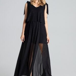 Czarna długa zmysłowa sukienka bez rękawów, wiązana na ramionach z dużym głębokim dekoltem. Górna część sukienki ozdobiona zwiewnym materiałem. W pasie wszyta gumka, z lewej strony rozcięcie od pasa. Pod spodem częściowo dopasowana sukienka z lekko rozkloszowanym dołem przed kolano.