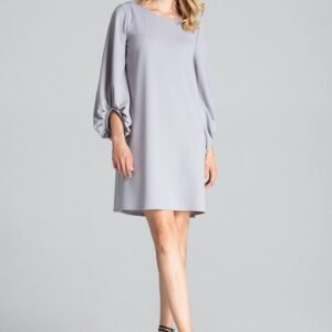 Szara trapezowa sukienka midi z długim bufiastym rękawem zakończonym marszczeniem, bez podszewki, bez kieszeni. Dekolt półokrągły.