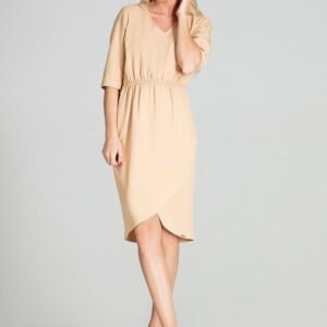 Beżowa wiosenna sukienka midi z rękawem 3/4 z wywijanym mankietem. Dekolt w serek, w pasie wszyta szeroka guma, dół zakładany, półokrągły.