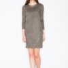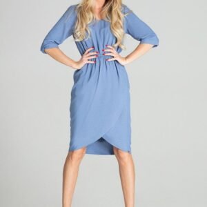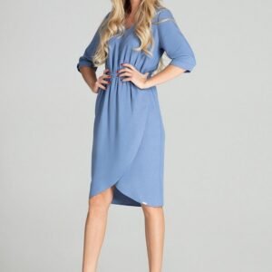 Niebieska wiosenna sukienka midi z rękawem 3/4 z wywijanym mankietem. Dekolt w serek, w pasie wszyta szeroka guma, dół zakładany, półokrągły.