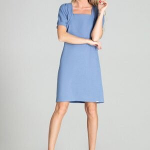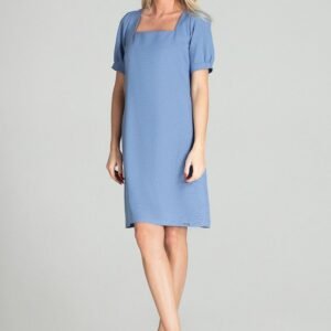 Niebieska wiosenna sukienka midi w kratkę, delikatnie taliowana, kwadratowy dekolt, krótki, bufiasty rękaw z mankietem.
