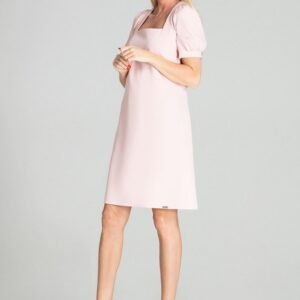 Różowa wiosenna sukienka midi w kratkę, delikatnie taliowana, kwadratowy dekolt, krótki, bufiasty rękaw z mankietem.