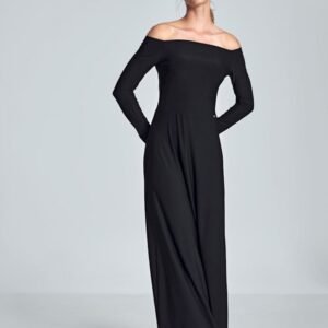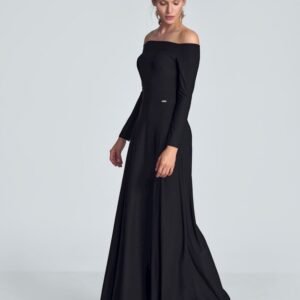 Czarna zmysłowa sukienka maxi z długim rękawem, duży dekolt odkrywający ramiona, zakładki w biuście, przeszyta w pasie.