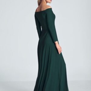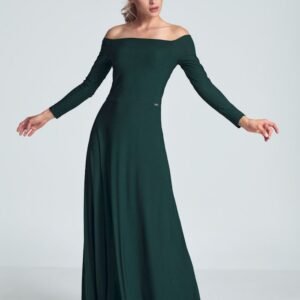 Zielona zmysłowa sukienka maxi z długim rękawem, duży dekolt odkrywający ramiona, zakładki w biuście, przeszyta w pasie.