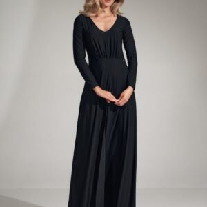 Czarna długa rozkloszowana sukienka z dekoltem w serek, marszczona w pasie z wszytą gumką. Długi rękaw, z przodu ozdobne rozcięcie. Bez zapięcia. Elastyczny materiał.