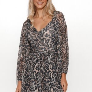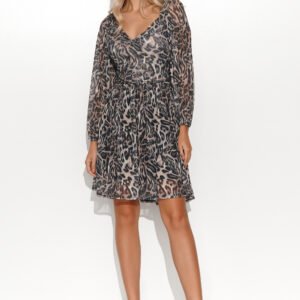 Zwiewna sukienka o niezwykle dziewczęcym fasonie. Posiada długi, lekko bufiasty rękaw. Z przodu widoczny jest dość mocno wycięty dekolt, z materiałem zebranym na biuście. Centralnie wszyty został kawałek materiału, który imituje kokardę. Z tyłu sukienki obecne jest wiązanie wraz ze ściągaczem. Chociaż plecy są widoczne, w sukience zawarty jest dodatkowy pasek materiału, który zakrywa bieliznę. Dzięki temu możesz założyć do tej kreacji biustonosz. Oznacza to, że ten dziewczęcy fason sukienki jest zarezerwowany również dla pań z większym biustem. Gumka ściągająca jest obecna również na linii talii. Spodnia część sukienki jest uszyta z jednolitego materiału. Z kolei wierzchnia to wzorzysta siatka dostępna w trzech wariantach, które różnią się między sobą kolorem i motywem.