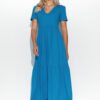 Długa letnia suknia, podzielona na segmenty imitujące subtelne falbany, to kwintesencja lekkości i romantyzmu. Sukienka, wiązana na cienkich sznurkach, dodaje wyjątkowej delikatności i swobody ruchów. Przekładany dekolt w serek subtelnie podkreśla biust, dodając kreacji kobiecego uroku. Ozdobna złota blaszka wszyta z tyłu dodaje sukience elegancji i wyjątkowego blasku. Letnia kreacja występuje w różnorodnych kolorach, co pozwala na dopasowanie do indywidualnych preferencji i stylu.