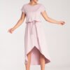 Satynowa sukienka midi, dekolt w serek z klapkami, długi bufiasty rękaw zakończony szerokim mankietem zapinanym na guziki, w pasie wszyty szeroki pas, zapinana z boku na zamek, lekko rozkloszowana.
