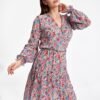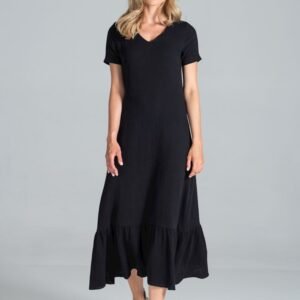 Sukienka midi z dekoltem w serek, z krótkim rękawem, lekko rozkloszowana do dołu, z falbaną.