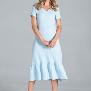 Sukienka midi z dekoltem w serek, z krótkim rękawem, lekko rozkloszowana do dołu, z falbaną.