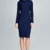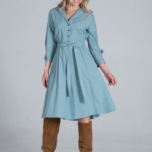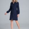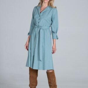 Sukienka midi z żakietowym kołnierzykiem w serek, zapinana do połowy na guziki, rękaw 7/8 z wiązaniem. W pasie wszyta gumka oraz pasek do wiązania, rozkloszowana do dołu.