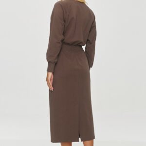 Dresowa sukienka to casualowa kreacja o długości midi, idealna na co dzień. Ma luźny krój w górnej części a długie rękawy typu raglan podkreślają swobodny i sportowy charakter. Dekolt jest zaokrąglony, prosty i subtelny, co pasuje do ogólnego, minimalistycznego stylu sukienki. W talii znajduje się szeroki, elastyczny pas, który podkreśla sylwetkę, dodając kobiecego akcentu do tego prostego fasonu. Dół sukienki jest prosty, ołówkowy, sięgający za kolano. Krój ten zapewnia wygodę, a jednocześnie podkreśla kobiecą sylwetkę. Po bokach znajdują się praktyczne kieszenie, które sprawiają, że jest funkcjonalna i wygodna. Sukienka jest uniwersalna i wygodna, doskonała na codzienne wyjścia. Łączy w sobie sportowy luz z eleganckim minimalizmem, co sprawia, że jest idealnym wyborem na różne okazje, zarówno do pracy, jak i na spotkania towarzyskie.