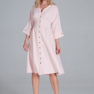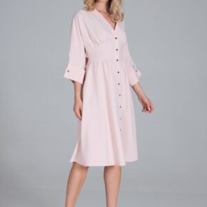 Sukienka midi z dekoltem w serek, zapinana na guziki, kimonowa góra. Rękaw 3/4 wykończony szerokim mankietem. W pasie szeroki karczek. Dół rozkloszowany. Sukienka bez podszewki.