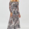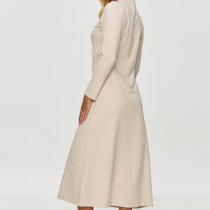 Drapowana sukienka tworzy elegancką i minimalistyczną propozycję, która łączy w sobie prostotę z subtelnymi detalami. Model ma długość midi, sięgającą do połowy łydki, co nadaje jej szykowności i klasycznego wyglądu. Krój jest prosty, ale z efektownym akcentem w postaci marszczenia po lewej stronie talii, które dodaje sukience kształtu i podkreśla sylwetkę. Model posiada długie rękawy, które zapewniają komfort i sprawiają, że model jest odpowiedni na chłodniejsze dni. Wysoka stójka dodaje sukience elegancji, a jednocześnie utrzymuje ją w casualowym stylu. Drapowanie w okolicy talii to delikatny detal, który nadaje jej dynamiki i lekkości, subtelnie eksponując kobiece kształty. Dzięki neutralnym kolorom sukienka może być łatwo zestawiona z różnymi dodatkami, zarówno w stylu eleganckim, jak i bardziej casualowym. Model jest idealny dla kobiet, które cenią sobie komfort, prostotę, ale jednocześnie nie rezygnują z kobiecego stylu. Możesz ją zestawić ze sportowym obuwiem zyskując outfit o nowoczesnym i sportowym charakterze. Taka stylizacja sprawdzi się na co dzień, na spotkania ze znajomymi czy na spacer.