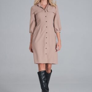 Koszulowa sukienka midi, delikatnie taliowana z kołnierzykiem. Bufiasty rękaw 3/4 z mankietem. Zapinana z przodu na guziki. Na wysokości biustu naszyte kieszenie.