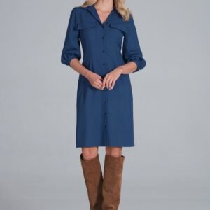 Koszulowa sukienka midi, delikatnie taliowana z kołnierzykiem. Bufiasty rękaw 3/4 z mankietem. Zapinana z przodu na guziki. Na wysokości biustu naszyte kieszenie.