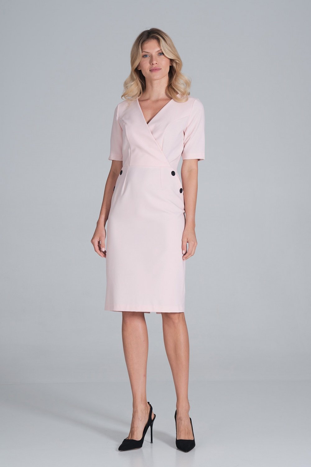 Ołówkowa sukienka midi z kopertowym dekoltem, odcinana w pasie z zaszewkami i ozdobnymi guzikami imitującymi kieszenie. Krótki rękaw, zapinana z tyłu na zamek, bez podszewki.