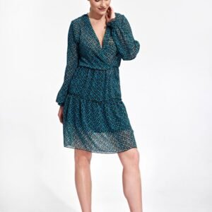 Letnia, zwiewna sukienka mini z długim rękawem zakończonym gumką. W pasie wszyta cienka gumka, kopertowy dekolt, dół spódnicy z ozdobną falbaną. Wszyta podszewka w spódnicy, bez zapięcia.