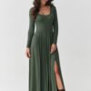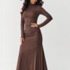 Długa printowa sukienka wykonana z lekkiego, zwiewnego materiału, który nadaje jej eleganckiego i romantycznego wyglądu. Wzór sukienki to złożona mieszanka motywów roślinnych, zwierzęcych i abstrakcyjnych, w kolorach dominujących czarnych, białych, beżowych, brązowych i odcieniach pomarańczy. Wzór jest skomplikowany i jednocześnie oryginalny dodający kreacji wyrazistego stylu. Model ma lekko dopasowaną górę, która podkreśla talię, natomiast dół jest rozkloszowany, co dodaje jej lekkości i ruchu. Wykończenie sukienki jest subtelne, a materiał jest półprzezroczysty, co podkreśla jej delikatność. Sukienka posiada wiskozową podszewkę, która dyskretnie zakrywa strategiczne miejsca i zapewnia komfort podczas noszenia. W połączeniu z ciężkimi butami za kostkę tworzy kontrast z subtelnością sukienki, nadając całości nieco bardziej casualowy wygląd. Sukienka idealnie nadaje się na jesienne lub zimowe wieczory, dzięki swoim ciepłym kolorom i długim rękawom. Kreacja jest dostępna w pięciu wariantach, różniących się kolorem i wzorem.