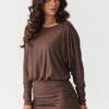 Długa printowa sukienka wykonana z lekkiego, zwiewnego materiału, który nadaje jej eleganckiego i romantycznego wyglądu. Wzór sukienki to złożona mieszanka motywów roślinnych, zwierzęcych i abstrakcyjnych, w kolorach dominujących czarnych, białych, beżowych, brązowych i odcieniach pomarańczy. Wzór jest skomplikowany i jednocześnie oryginalny dodający kreacji wyrazistego stylu. Model ma lekko dopasowaną górę, która podkreśla talię, natomiast dół jest rozkloszowany, co dodaje jej lekkości i ruchu. Wykończenie sukienki jest subtelne, a materiał jest półprzezroczysty, co podkreśla jej delikatność. Sukienka posiada wiskozową podszewkę, która dyskretnie zakrywa strategiczne miejsca i zapewnia komfort podczas noszenia. W połączeniu z ciężkimi butami za kostkę tworzy kontrast z subtelnością sukienki, nadając całości nieco bardziej casualowy wygląd. Sukienka idealnie nadaje się na jesienne lub zimowe wieczory, dzięki swoim ciepłym kolorom i długim rękawom. Kreacja jest dostępna w pięciu wariantach, różniących się kolorem i wzorem.