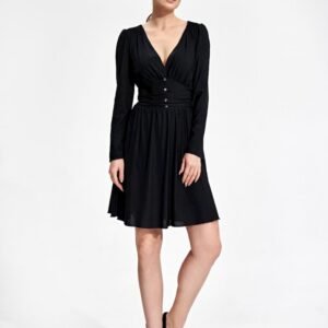 Rozkloszowana sukienka za kolano z elastycznego materiału. Duży dekolt w serek, długi rękaw. Drapowany pas z ozdobnymi guziczkami. Sukienka bez podszewki oraz zapięcia.