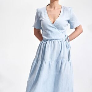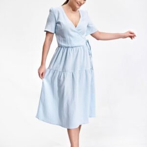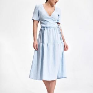 Letnia sukienka midi z krótkim rękawem, kopertowy dekolt z ozdobnym wiązaniem na boku. Sukienka o rozkloszowanym kroju, zapinana na kryty zamek, bez kieszeni.