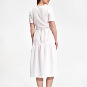 Letnia sukienka midi z krótkim rękawem, kopertowy dekolt z ozdobnym wiązaniem na boku. Sukienka o rozkloszowanym kroju, zapinana na kryty zamek, bez kieszeni.