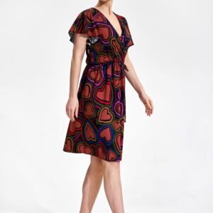 Letnia sukienka midi z kopertowym dekoltem i ozdobnym wiązaniem, krótki zwiewny rękaw. W pasie wszyta gumka. Ozdobne rozcięcie na boku. Bez podszewki, bez zapięcia, bez kieszeni.