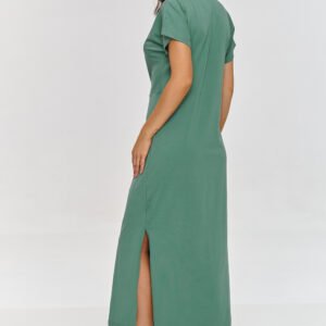 Ta sukienka maxi to doskonały wybór dla kobiet, które szukają połączenia wygody i stylu. Model posiada delikatne przełożenie w talii, które nie tylko podkreśla kobiecą sylwetkę ale również dodaje jej efektownego designu. Dzięki temu całość wygląda spójnie i stylowo. Rozcięcie z boku nadaje jej lekkości i zmysłowości. Odsłaniając delikatnie nogi, wprowadza do stylizacji dynamiczny element, jednocześnie pozwalając na większą swobodę ruchów. Okrągły dekolt, krótki rękaw i długość maxi podkreślają uniwersalność całej kreacji. Sukienka została wykonana z lekkiego, przewiewnego bawełnianego materiału, idealnego na cieplejsze dni. Dzięki niemu skóra może oddychać, zapewniając Ci komfort przez cały dzień. Projekt łączy w sobie minimalizm i elegancję. Dzięki prostemu krojowi, sukienka wygląda świeżo i nowocześnie, doskonale pasując zarówno do codziennych stylizacji, jak i na spotkania towarzyskie. Kreacja świetnie komponuje się z białymi sneakersami na co dzień, jak również z eleganckimi sandałami czy szpilkami, nadając się na przyjęcia, wypady na miasto, czy letnie spacery.