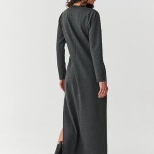 Ta sukienka maxi to idealne połączenie wygody i minimalistycznej elegancji. Wykonana z miękkiego, elastycznego materiału, doskonale dopasowuje się do sylwetki, zapewniając komfort noszenia przez cały dzień. Prosty, pudełkowy krój został urozmaicony długim rękawem oraz rozcięciem po boku, które nadaje całości lekkości i subtelnie podkreśla nogi. Na uwagę zasługuje także delikatny ściągacz przy szyi, który elegancko wykańcza zaokrąglony dekolt i nadaje sukience bardziej dopracowanego charakteru. To subtelny detal, dzięki któremu model zyskuje sportowo-casualowy akcent, zachowując jednocześnie swoją kobiecą i minimalistyczną formę. Możesz nosić ją z wygodnymi trampkami czy botkami, tworząc miejski look, a w zestawieniu ze szpilkami i wyrazistą biżuterią zyskuje wieczorowy charakter. To uniwersalny model, który sprawdzi się w wielu sytuacjach, od spotkań z przyjaciółmi, przez codzienne wyjścia do pracy, aż po mniej formalne przyjęcia. Jej prostota sprawia, że można ją łatwo łączyć z różnymi dodatkami, tworząc stylizacje na każdą okazję. Sukienka maxi z długim rękawem i rozcięciem to must-have w garderobie każdej kobiety ceniącej wygodę, praktyczność i nowoczesny design.