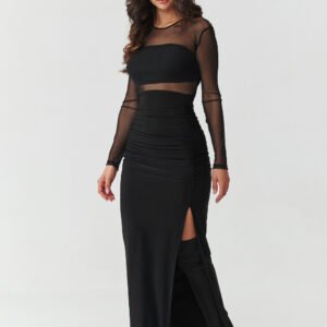 Wejdź w świat elegancji, który hipnotyzuje od pierwszego spojrzenia. Ta czarna sukienka maxi z siateczką to propozycja dla kobiet, które nie boją się błyszczeć i pragną poczuć się absolutnie wyjątkowo. Dopasowany krój idealnie podkreśla sylwetkę, a subtelne marszczenia w talii modelują figurę, nadając jej zmysłowej lekkości. Transparentna góra z delikatnej siateczki sprawia, że sukienka nabiera tajemniczego charakteru gdzie elegancja spotyka się tu z odwagą. Dodatkowo pod tiulem znajduje się niezależny top, który możesz wykorzystać do innych stylizacji. Zmysłowe rozcięcie odsłania nogę przy każdym kroku, dodając całości kobiecego magnetyzmu. Pozłacany guzik z tyłu, nie tylko pełni funkcję praktyczną, ale także dodaje jej biżuteryjnego charakteru pięknie kontrastując z głęboką czernią materiału. Ten subtelny akcent sprawia, że sukienka zyskuje luksusowy wygląd, a jednocześnie staje się wyjątkowa w każdym detalu. To nie jest zwykła sukienka wieczorowa to kreacja, w której poczujesz, że wszystkie spojrzenia są skierowane właśnie na Ciebie. Doskonała na wesele, bal, studniówkę czy elegancką kolację, zawsze sprawi, że wyróżnisz się stylem i pewnością siebie. Odważna, hipnotyzująca, idealna dla kobiety, która pragnie zrobić piorunujące wrażenie i zostawić po sobie wspomnienie niezatarte, jak sama sukienka.