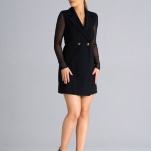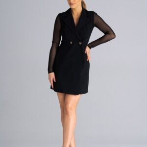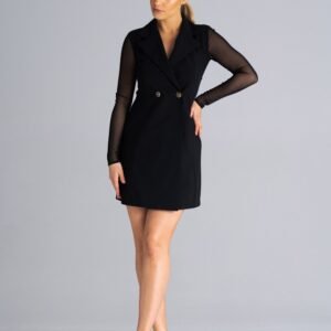 Sukienka mini żakietowa, z długim rękawem oraz plecami z siatki. Sukienka zapinana na guziki, z kołnierzykiem.