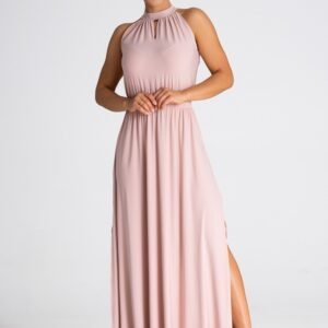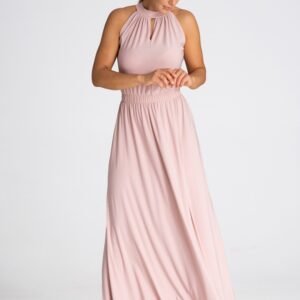 Prezentujemy wyjątkową sukienkę maxi, która zachwyca swoim urokiem. Sukienka ma zapięcie z tyłu na efektowne perełki, co dodaje jej elegancji. Bez rękawów, co nadaje lekkości i wygodę. W pasie znajduje się elastyczna gumka, która podkreśla talię i zapewnia komfort noszenia. Góra sukienki jest efektownie marszczona, z pęknięciem w dekolcie, co nadaje jej subtelności i uroku. Dodatkowo, sukienka posiada pęknięcia z dwóch stron, co dodaje jej oryginalności i stylu. To sukienka, która z pewnością przyciągnie uwagę i sprawi, że poczujesz się wyjątkowo na każdej specjalnej okazji.