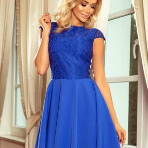 Rozkloszowana sukienka MARTA z koronką – chabrowa. Marka numoco. Produkcja Polska.