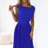 Klasyczna sukienka ze złotymi zamkami, rękawkiem 3/4 i trapezową spódnicą. Uszyta z przyjemnego w dotyku elastycznego materiału w kolorze granatowym. Produkt polski. Marka numoco.