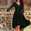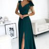 Rozkloszowana sukienka z kopertowym dekoltem i krótkim rękawkiem. Uszyta z lekko elastycznego materiału w kolorze zielonym. Marka numoco. Produkt polski.