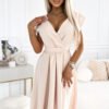Szyfonowa sukienka midi z długim rękawkiem i elegancko wykończonym dekoltem. Sukienka w kolorze beżowym. Cała sukienka jest uszyta na podszewce. Marka numoco. Produkcja polska.