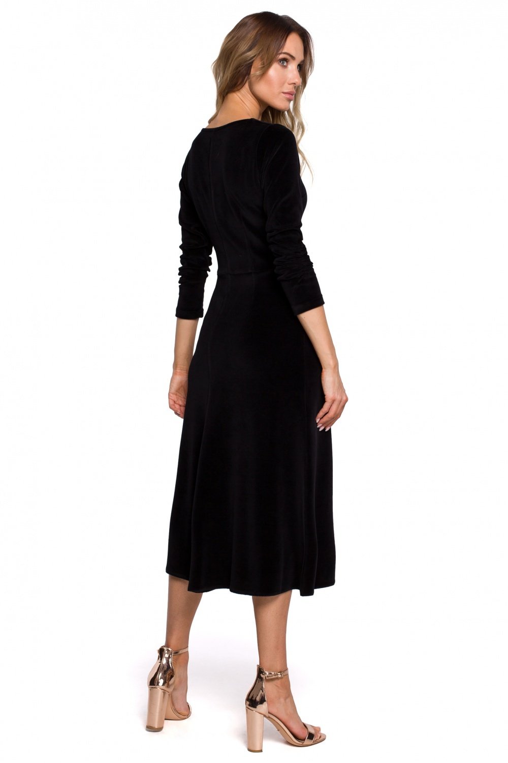 Welurowa sukienka o klasycznym kobiecym kroju. Wzrok przyciągają ciekawe, marszczone rękawy i dół o fasonie rybki sięgający poniżej kolan. Idealna propozycja na uroczystą kolację. Sukienka zapinana na kryty zamek, bez podszewki.