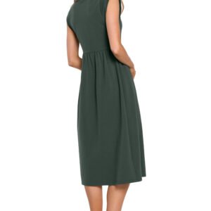 Sukienka z dzianiny o długości midi. Odcinana w pasie z podwyższoną talią i luźną spódnicą, optycznie zwęża talię, a dzięki prostemu krojowi dodatkowo wysmukla całą sylwetkę. Posiada charakterystyczne, bardzo krótkie rękawki oraz zabudowany dekolt. Świetnie sprawdzi się zarówno na co dzień, jak i jako sukienka wizytowa.
