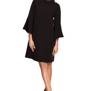 Sukienka o fasonie trapezu lub inaczej litery A nie tylko dodaje dziewczęcego uroku, ale również pomaga tuszować mankamenty sylwetki. My zadbaliśmy jeszcze o detale, które czynią ją wyjątkową, szerokie, falbaniaste rękawy ozdobiliśmy delikatną tasiemką z kulistymi wypustkami. Sukienka bez podszewki.