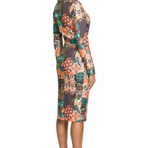 Ołówkowa midi nie musi być nudna jeśli jest uszyta z materiału z ciekawym wielokolorowym nadrukiem. My zadbaliśmy też o detale takie jak kołnierzyk, zapięcie pod szyją i wiązany pasek, który dodatkowo podkreśli talię. Sukienka wkładana przez głowę.