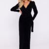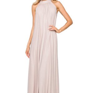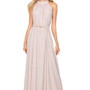 Jedna suknia i kilka możliwości stylizacji. Rozkloszowany fason w wersji maksi z dekoltem typu halter to sprawdzone rozwiązanie dla pań ceniących sobie swobodę, lub chcących zamaskować mankamenty figury. Sukienka wykonana z materiału z brokatem, bez podszewki. Do kompletu pasek do wiązania.
