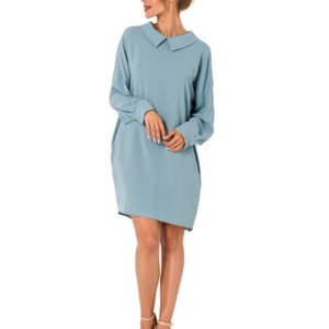Sukienka-tunika z kołnierzykiem i dekoltem na plecach ozdobionym łańcuszkiem. Sukienka z długim rękawem, o luźnym kroju.