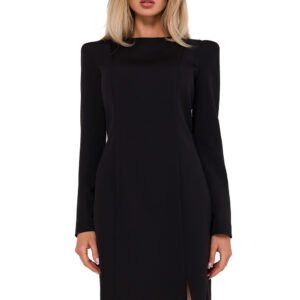 Sukienka z długim wąskim rękawem oraz modelującymi przeszyciami na przodzie. Sukienka bez podszewki, zapinana na kryty zamek. Na ramionach przeszycia z wszytymi wysokimi poduszkami. Zaprojektowana i uszyta w Polsce.