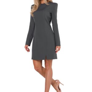 Sukienka z długim wąskim rękawem oraz modelującymi przeszyciami na przodzie. Sukienka bez podszewki, zapinana na kryty zamek. Na ramionach przeszycia z wszytymi wysokimi poduszkami. Zaprojektowana i uszyta w Polsce.