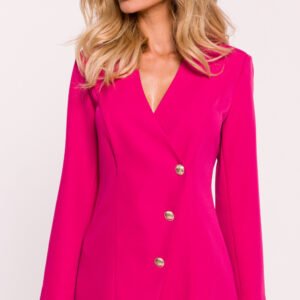 Sukienka żakietowa z kołnierzem, stworzona z eleganckiej tkaniny, oferuje unikalne połączenie klasyki i nowoczesnego stylu. Fason niedopasowany zapewnia swobodny, luźny krój, idealny do codziennych oraz bardziej formalnych okazji. Długie rękawy oraz dekoracyjne złote guziki na przodzie, które są nierozpinane, dodają sukience szyku i elegancji. Z tyłu znajduje się kryty zamek, który ułatwia zakładanie i zdejmowanie. Sukienka ma długość nad kolano i nie posiada podszewki, co sprawia, że jest lekka i komfortowa. Zaprojektowana i uszyta w Polsce, łączy w sobie najwyższą jakość wykonania z nowoczesnym designem.