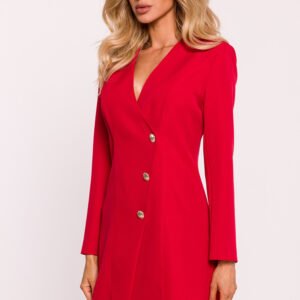 Sukienka żakietowa z kołnierzem, stworzona z eleganckiej tkaniny, oferuje unikalne połączenie klasyki i nowoczesnego stylu. Fason niedopasowany zapewnia swobodny, luźny krój, idealny do codziennych oraz bardziej formalnych okazji. Długie rękawy oraz dekoracyjne złote guziki na przodzie, które są nierozpinane, dodają sukience szyku i elegancji. Z tyłu znajduje się kryty zamek, który ułatwia zakładanie i zdejmowanie. Sukienka ma długość nad kolano i nie posiada podszewki, co sprawia, że jest lekka i komfortowa. Zaprojektowana i uszyta w Polsce, łączy w sobie najwyższą jakość wykonania z nowoczesnym designem.