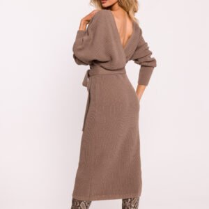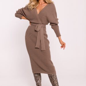 Sukienka swetrowa wykonana z przędzy o prążkowanym splocie, zakładana przez głowę. Posiada kopertową górę z dekoltem zarówno z przodu, jak i z tyłu, co dodaje subtelnej elegancji. Długie kimonowe rękawy zakończone ściągaczami zapewniają wygodę i stylowy wygląd. Dopasowany dół podkreśla sylwetkę, a pasek do przewiązania w talii pozwala na indywidualne dopasowanie. Sukienka o długości sięgającej pół łydki, idealna na chłodniejsze dni. Zaprojektowana i uszyta w Polsce, łączy w sobie komfort i wyrafinowaną estetykę.