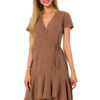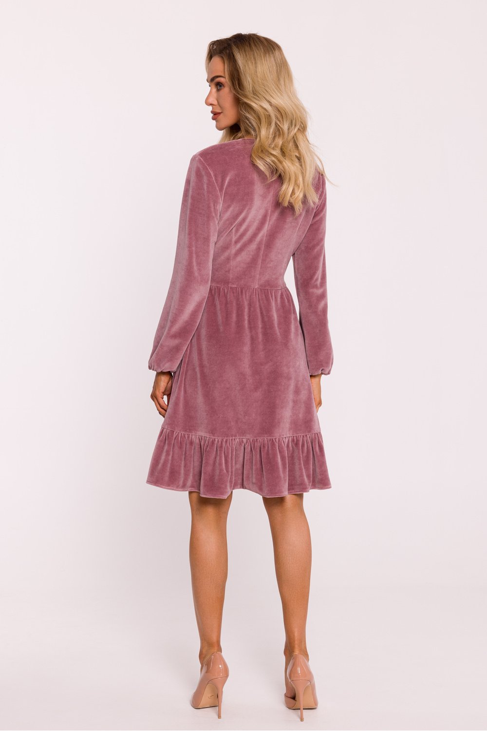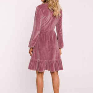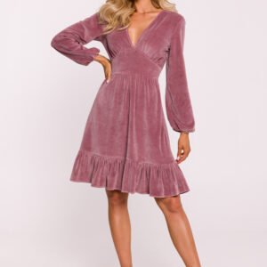 Stylowa sukienka wykonana z miękkiej dzianiny welurowej, która łączy elegancję z komfortem. Model z podkreśloną talią, który pięknie eksponuje kobiecą sylwetkę, oraz głęboki dekolt w kształcie litery V, dodający całości zmysłowości. Długie bufiaste rękawy zakończone gumką nadają sukience romantyczny charakter i lekkość. Dół sukienki jest lekko rozkloszowany i wykończony falbaną, co wprowadza subtelny ruch i elegancję, a długość przed kolano sprawia, że jest to idealna propozycja na wiele okazji. Kryty zamek z boku zapewnia wygodne zapięcie, a brak podszewki sprawia, że sukienka jest lekka i komfortowa w noszeniu. Zaprojektowana i uszyta w Polsce, ta sukienka to doskonały wybór dla kobiet pragnących połączyć modny wygląd z wygodą na co dzień i podczas specjalnych wydarzeń.