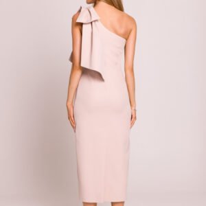 Elegancka sukienka midi o ołówkowym fasonie, podkreślająca kobiecą sylwetkę. Model zachwyca asymetrycznym krojem z motywem na jedno ramię, ozdobionym efektowną kokardą, która dodaje szyku i wyjątkowego charakteru. Wysokie rozcięcie z tyłu subtelnie eksponuje nogę, nadając kreacji lekkości i zmysłowości. Sukienka zapinana jest na boku na kryty zamek, co zapewnia idealne dopasowanie. Częściowa podszewka gwarantuje komfort noszenia. Zaprojektowana i uszyta w Polsce z dbałością o każdy detal.